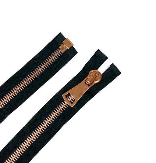 Zip Up Glossy 15MM One-Way Separating Open Bottom Zipper Black Tape Rose Gold Teeth